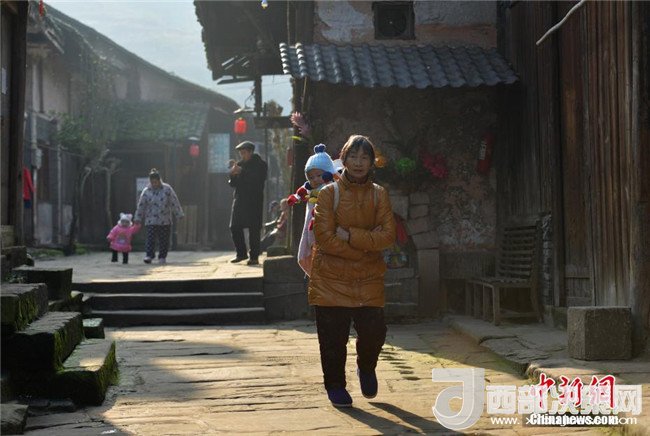 12月19日,晨光中的老人背著孩子行走在福寶古鎮(zhèn)街頭。四川瀘州合江縣福寶鎮(zhèn)位于川渝黔交界處的大漕河畔,始建于元朝初年,保存較好的明清吊腳樓隨山勢起伏,錯落有致,被譽(yù)為四川鄉(xiāng)村民居的活化石。 (記者 劉忠俊 攝)