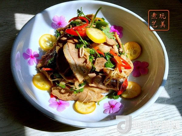 金桔與鴨脯及辛香配料經(jīng)抓拌后,互相大融和,各自奉獻(xiàn)精華,滋潤的金桔,有份鴨油香,鴨脯肉里充滿桔香,吃過的都夸我好吃。