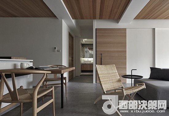原木和灰色的主線搭配中加入了一只淡黃色抱枕點(diǎn)綴,既不破壞整體的恬淡舒適,又能使空間顯得更加有活力。