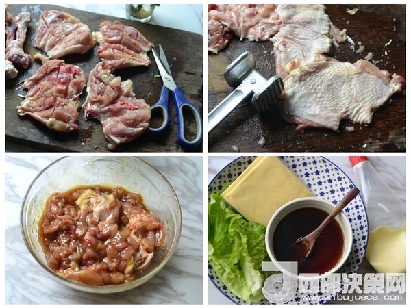 1、將冷卻好的面包胚從中間切開,然后放入生菜、芝士片、照燒雞腿和沙拉醬就好。