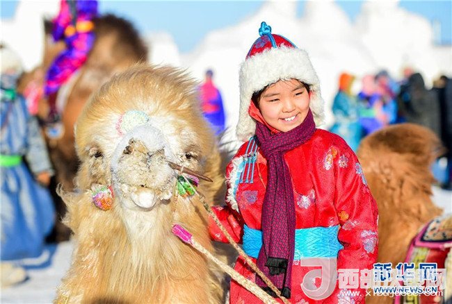 1月9日,一名蒙古族小朋友和駱駝合影。記者 連振 攝