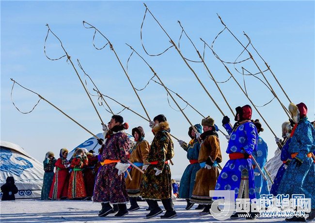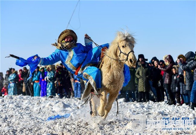 1月16日,在內(nèi)蒙古錫林浩特鳳凰馬場,當?shù)啬撩癖硌萏遵R。