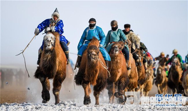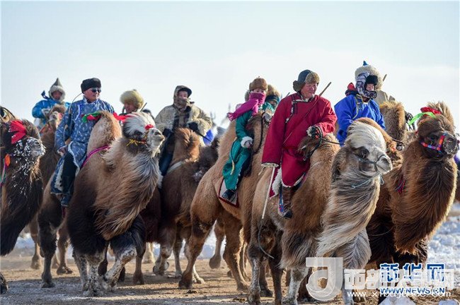 1月16日,在內(nèi)蒙古錫林浩特鳳凰馬場,當?shù)貫跆m牧騎的演員們騎著駱駝進入會場演出。