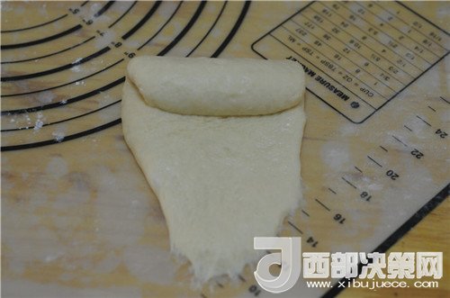 7.取一個(gè)小劑子,搟成牛舌狀后,卷起來(lái)