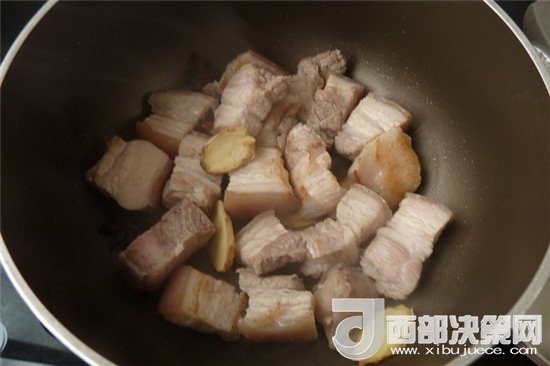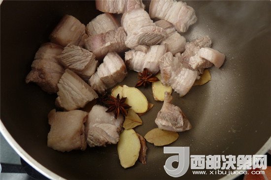 4.把肉炒至有點(diǎn)了出油后加入八角,姜片,香葉