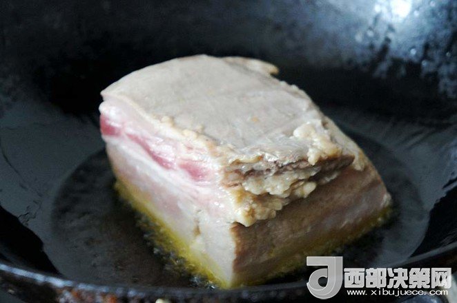 7.慢慢煎至五花肉肉皮呈深紅色,肉塊的周圍也煎至金黃色