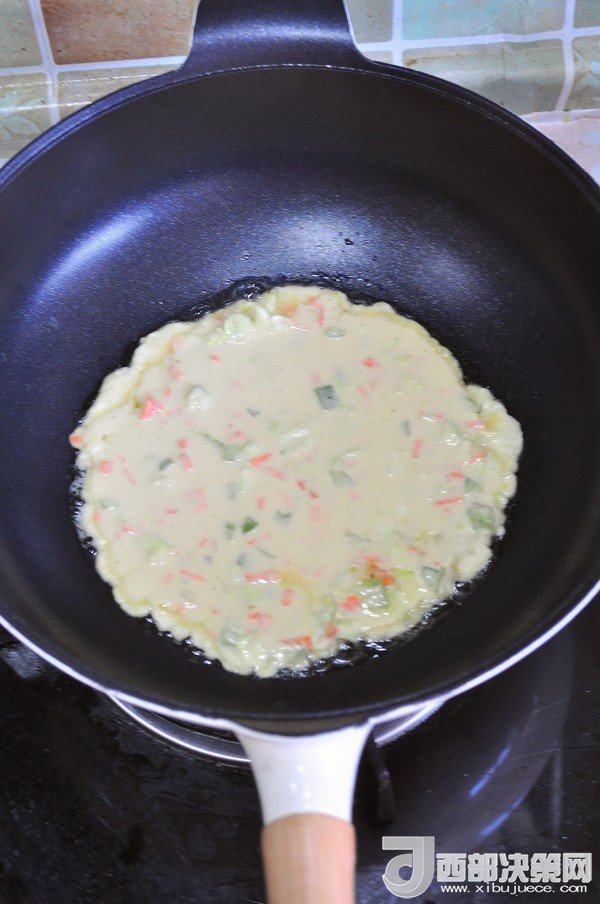 主料:胡蘿卜 10克 青椒 10克 培根 1片 雞蛋 50克 包菜 10克 面粉 40克