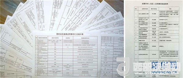 拼版照片:左圖為2017年4月23日在四川成都拍攝的清理前的313項(xiàng)村(社區(qū))需要開具的證明事項(xiàng)目錄;右圖為2017年4月24日拍攝的清理后的15項(xiàng)村(社區(qū))需要開具的證明事項(xiàng)目錄。 新華社記者薛玉斌攝