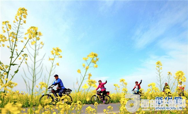 3月11日,在成都邛崍市冉義鎮(zhèn),幾名騎行愛好者穿行在花田之間。