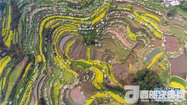 俯瞰四川省犍為縣塘壩鄉(xiāng)新房村田園一角,梯田上的油菜花、李花競相開放(3月12日攝)。