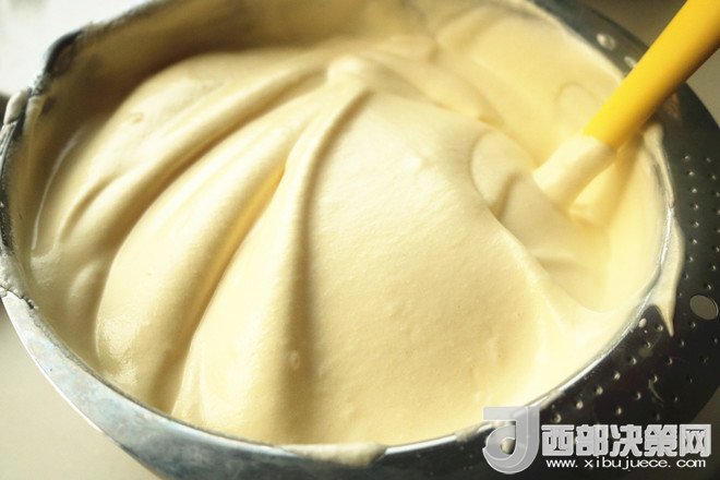 4.繼續(xù)用手抽拌勻,很細膩順滑。后蛋法不容易使面糊起筋,做出的蛋糕更細膩,也不易回縮。拌好的蛋黃糊待用。