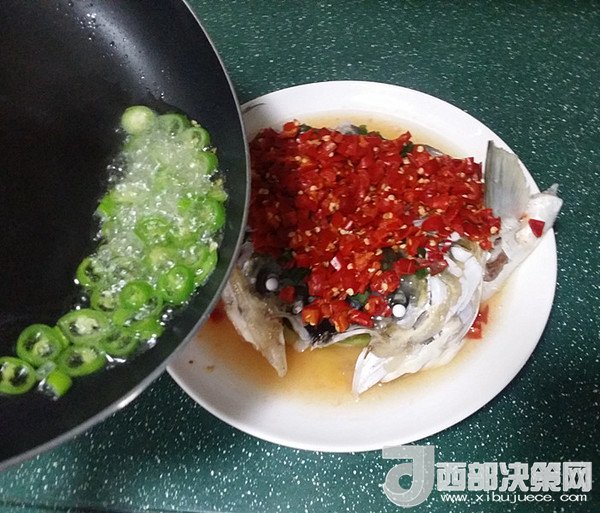 11.同時另起鍋燒熱油、下蔥花與杭椒爆香、然后趁熱淋在魚頭上