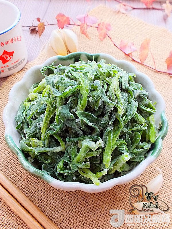 2.放入玉米淀粉和面粉,二者比例1:1,抓勻,使每片菜葉都裹上一層薄薄的粉,不用質(zhì)疑我為什么用一半的玉米淀粉,這樣做,蒸出來(lái)的菜口感好、顏色漂亮,不信您試試