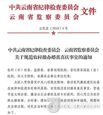 近日,云南省紀委、監(jiān)察委下發(fā)了《關(guān)于規(guī)范農(nóng)村操辦婚喪喜慶事宜的通知》(下稱《通知》),明確云南省農(nóng)村地區(qū)除為本人及子女操辦婚事,為直系親屬操辦喪事外,一律不操辦客事。