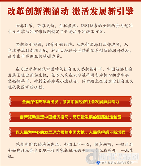“我們要以更大的力度、更實(shí)的措施全面深化改革、擴(kuò)大對(duì)外開放,貫徹新發(fā)展理念,推動(dòng)經(jīng)濟(jì)高質(zhì)量發(fā)展,建設(shè)現(xiàn)代化經(jīng)濟(jì)體系,不斷增強(qiáng)我國經(jīng)濟(jì)實(shí)力、科技實(shí)力、綜合國力,讓社會(huì)主義市場經(jīng)濟(jì)的活力更加充分地展示出來。”習(xí)近平總書記在十三屆全國人大一次會(huì)議上的重要講話,再次發(fā)出了全面深化改革的號(hào)召。