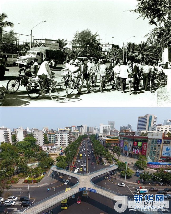 拼版照片為??谑旋埨ツ下方裎魧Ρ龋ㄉ蠄D為1993年6月30日新華社記者姜恩宇攝,下圖為2018年4月14日新華社記者郭程攝)。