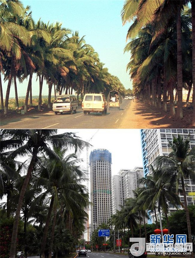 拼版照片為海口市濱海大道今昔對比(上圖為1990年1月10日新華社記者姜恩宇攝,下圖為2018年4月15日新華社記者趙穎全攝)。