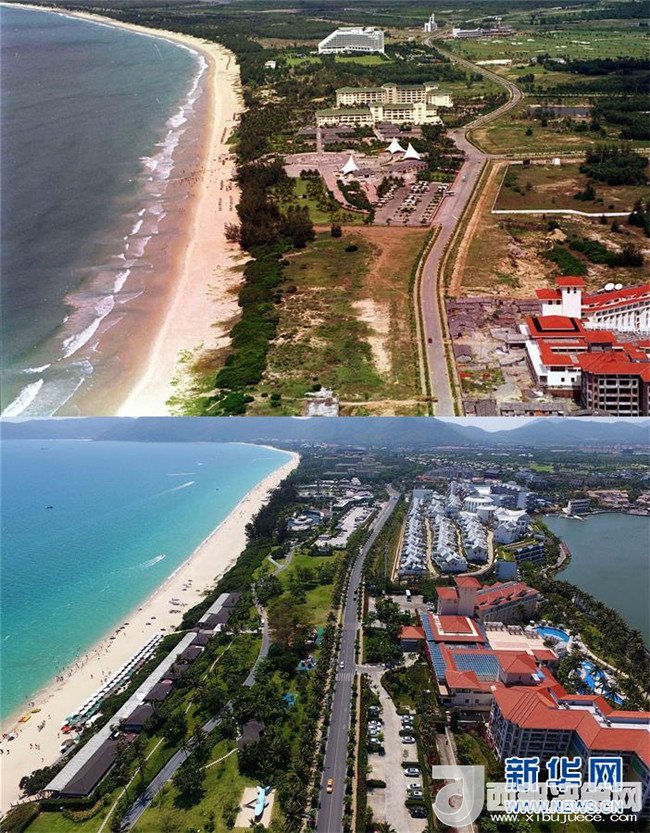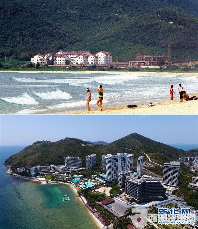 拼版照片為三亞市亞龍灣今昔對比(上圖為1998年新華社記者姜恩宇攝,下圖為2018年4月4日新華社記者郭程攝)。