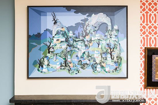 壁爐上方的墻面用掛畫來裝飾,藍色系的色彩與家居整體風格相融合,富有創(chuàng)意感的畫面讓家更有藝術(shù)氣息。
