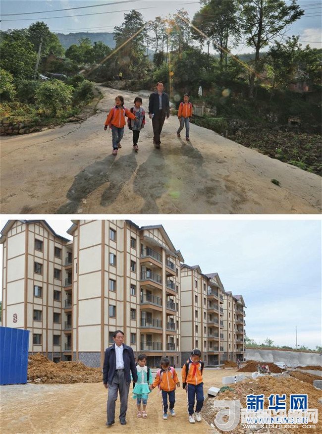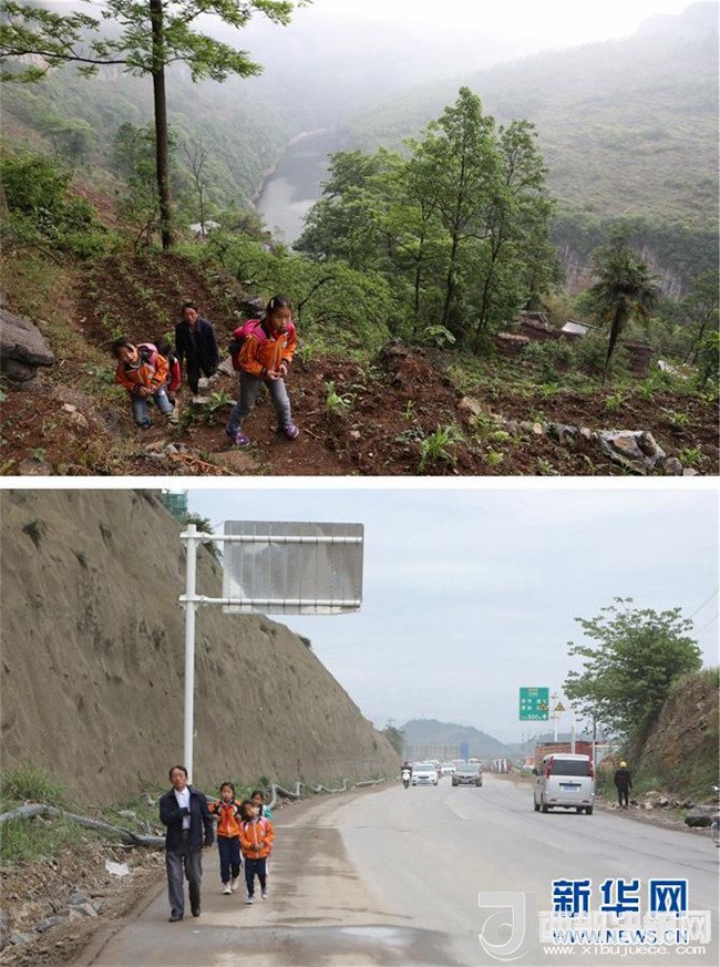 拼版照片:上圖為教師楊紹書和學(xué)生們?cè)谘卤谏系男÷沸凶?,他們的身旁是六沖河峽谷(4月27日攝);下圖為教師楊紹書和學(xué)生從新居內(nèi)走出前往新學(xué)校(5月7日攝)。