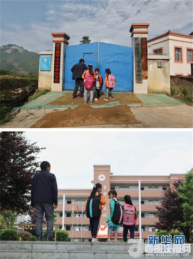 拼版照片:上圖為教師楊紹書和學(xué)生們經(jīng)過(guò)約2個(gè)小時(shí)的艱難跋涉到達(dá)華山小學(xué)(4月27日攝);下圖為教師楊紹書和學(xué)生們經(jīng)過(guò)20多分鐘的公路行走,到達(dá)黔西縣第十小學(xué)(5月7日攝)。