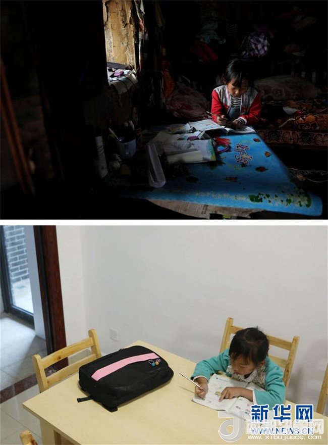 拼版照片:上圖為7歲的李曉彤在哈沖組的舊居內(nèi)做作業(yè)(4月27日攝);下圖為7歲的李曉彤在錦繡花都安置點(diǎn)新居內(nèi)做作業(yè)(5月7日攝)。