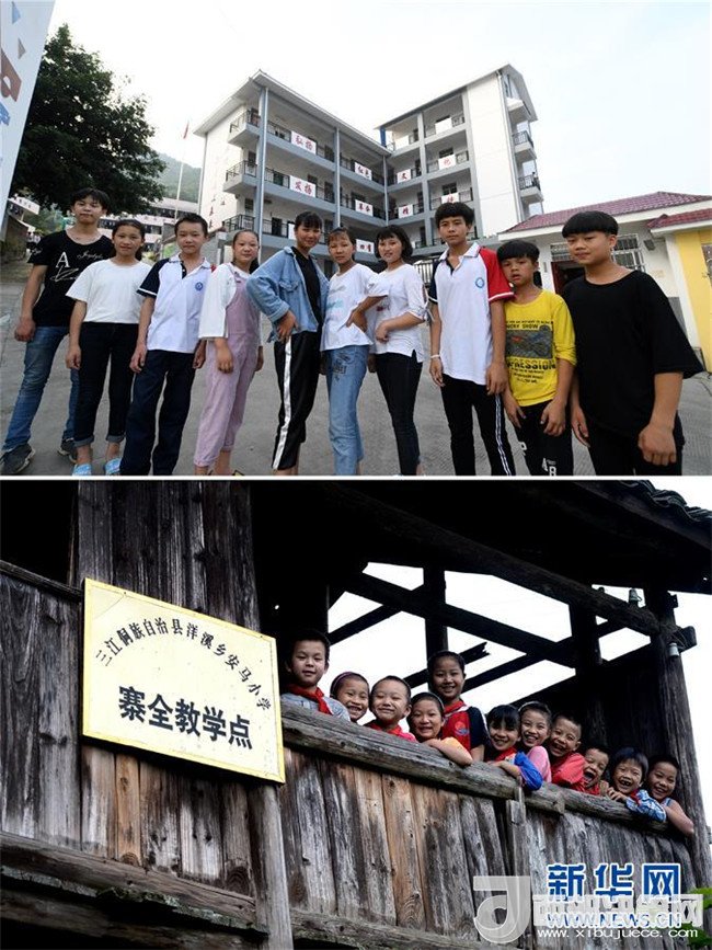 這是一張拼版圖片。上圖為2018年5月30日,在廣西三江侗族自治縣洋溪鄉(xiāng)中學,已經進入初一就讀的孩子們在校園里合影;下圖為2014年5月26日,孩子們在寨全教學點的吊腳樓教室上留影。