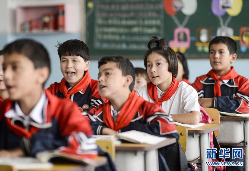 新疆疏附縣托克扎克鎮(zhèn)中心小學(xué)5年級1班同學(xué)們在上課(2017年9月26日攝)。新華社記者 趙戈 攝