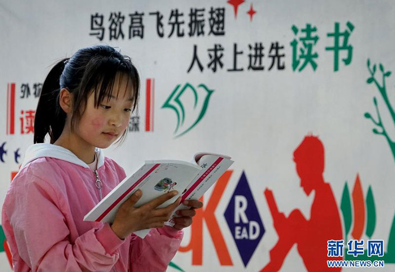 河南焦作市博愛縣寨豁鄉(xiāng)小學(xué)學(xué)生郭艷冰在校內(nèi)閱讀從“焦作市圖書館館外流通點(diǎn)”借閱的書籍(4月18日攝)。新華社記者 李安 攝