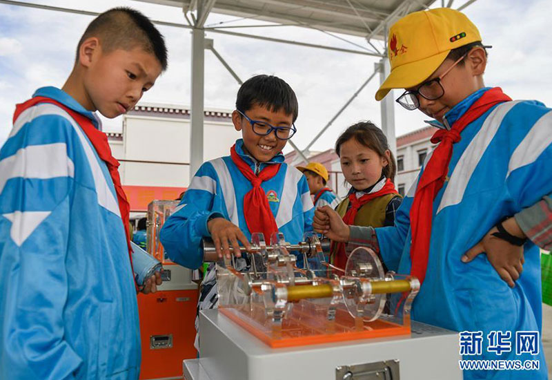 幾名學(xué)生在拉薩市流動科技館巡展活動現(xiàn)場體驗科學(xué)小實(shí)驗(5月24日攝)。 新華社記者 劉東君 攝