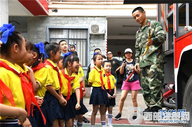 6月2日,孩子們和家長(zhǎng)在廣西南寧市青秀區(qū)公安消防大隊(duì)柳沙中隊(duì)參觀(guān)消防車(chē),了解消防設(shè)備使用方法。