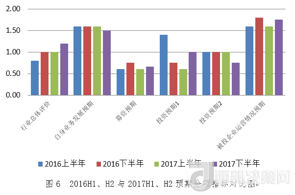 相較于募資、投資、退出指標(biāo)的微降,機(jī)構(gòu)信心指標(biāo)上漲顯示投資人對(duì)2018年北京地區(qū)股權(quán)投資發(fā)展充滿了信心。從預(yù)期分項(xiàng)指標(biāo)看,雖然指標(biāo)所處水平顯示投資人認(rèn)為2018年上半年行業(yè)總體仍將保持平穩(wěn)發(fā)展態(tài)勢(shì),對(duì)自身業(yè)務(wù)發(fā)展預(yù)期、募資預(yù)期、投資預(yù)期保持中性,但是行業(yè)總體評(píng)價(jià)、被投企業(yè)運(yùn)營(yíng)情況預(yù)期、募資預(yù)期、投資預(yù)期這四個(gè)指標(biāo)均較上期有所增長(zhǎng),而自身業(yè)務(wù)發(fā)展預(yù)期指標(biāo)和投資預(yù)期指標(biāo)較上期有所下降,綜合顯示投資人對(duì)行業(yè)和自身業(yè)務(wù)發(fā)展謹(jǐn)慎樂觀的態(tài)度。