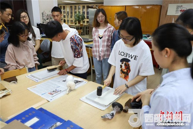 兩位同學(xué)在正在體驗碑文的傳拓技藝。中新社發(fā)瞿宏倫攝
