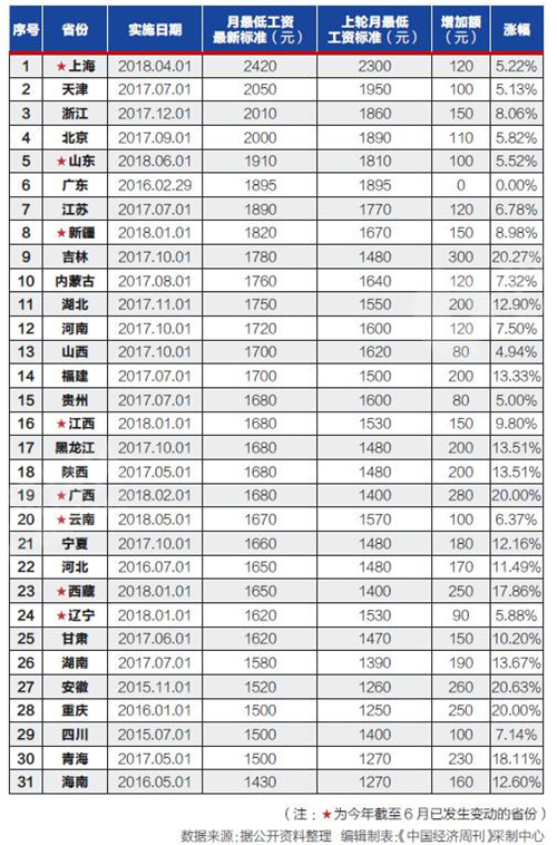 《中國經濟周刊》記者計算得出,2018年上調最低工資標準的8個省份,平均調增幅度為9.95%,僅廣西(20.00%)、西藏(17.86%)兩省份的調增幅度超過了11%的平均數,廣西的增加額最大,達280元,西藏的增加額也達到了250元。