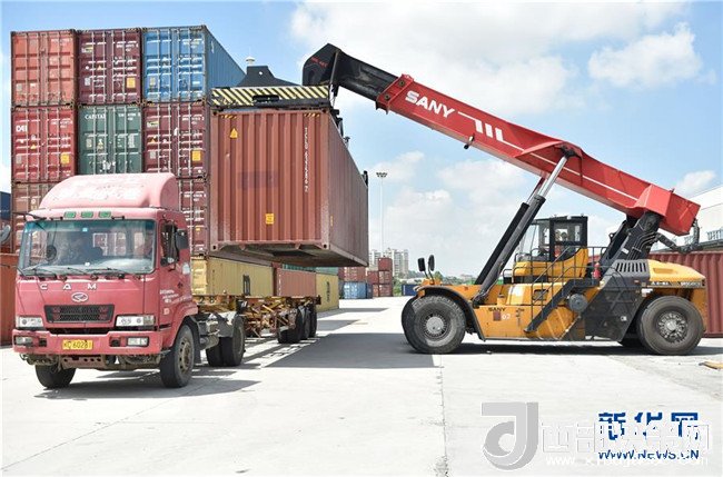 工程機(jī)械在福建晉江陸地港將集裝箱裝車(2017年7月12日攝)。新華社記者 宋為偉 攝