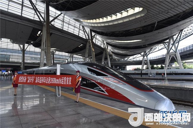 在北京南站拍攝的G13次“復(fù)興號(hào)”列車(2017年9月21日攝)。350公里時(shí)速的正式運(yùn)營(yíng),標(biāo)志著我國(guó)成為世界高鐵商業(yè)運(yùn)營(yíng)速度最高的國(guó)家。新華社記者羅曉光攝