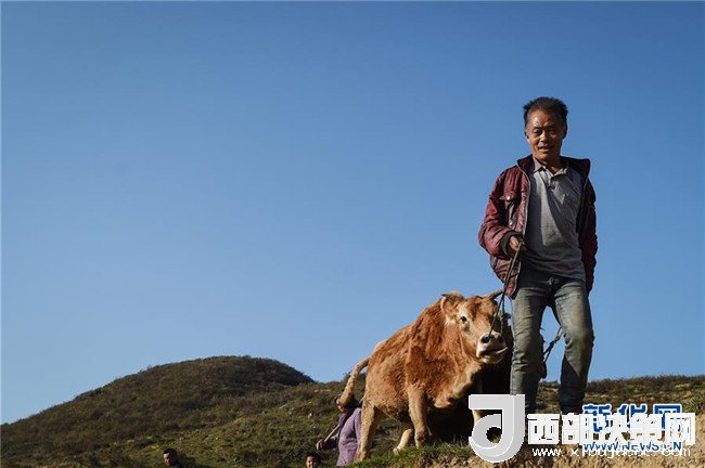 貴州畢節(jié)市七星關(guān)區(qū)長(zhǎng)春堡鎮(zhèn)埡關(guān)村農(nóng)民張祥印在放牛(2015年11月14日攝)。張祥印是當(dāng)?shù)氐呢毨?,年均純收入只有一千多元?015年,七星關(guān)區(qū)推出精準(zhǔn)扶貧套餐,張祥印選擇了養(yǎng)牛,走上脫貧致富之路。新華社記者 歐東衢 攝