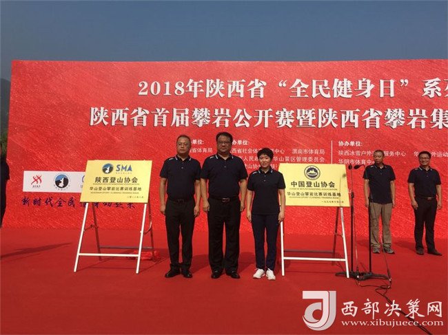 隨后陜西省登山協(xié)會(huì)主席陳錚向省攀巖集訓(xùn)隊(duì)教練組代表邱洪樹授“陜西省攀巖集訓(xùn)隊(duì)”隊(duì)旗,并頒發(fā)聘書。陜西省社會(huì)體育管理中心主任田凱、渭南市體育局副局長(zhǎng)王曉燕、陜西華山旅游集團(tuán)有限公司副總經(jīng)理趙江峰同志共同為“陜西省攀巖訓(xùn)練基地”揭牌。