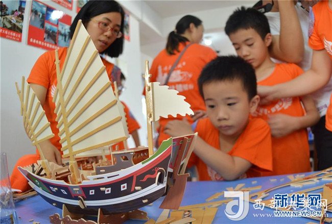 8月8日,“小候鳥(niǎo)”們與家長(zhǎng)一起動(dòng)手拼接福船模型。