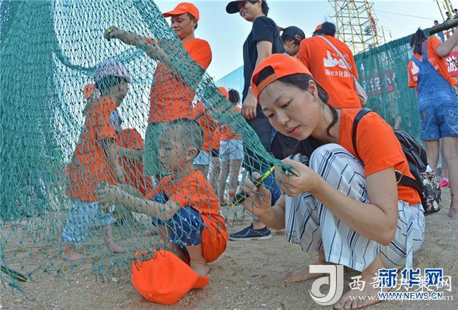 8月8日,“小候鳥(niǎo)”們與家長(zhǎng)一起體驗(yàn)漁網(wǎng)制作。