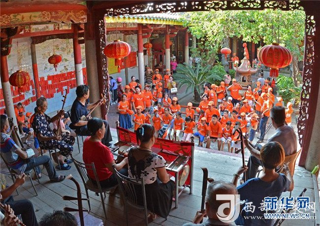 8月8日,“小候鳥(niǎo)”們與家長(zhǎng)一起欣賞非物質(zhì)文化遺產(chǎn)——北管。