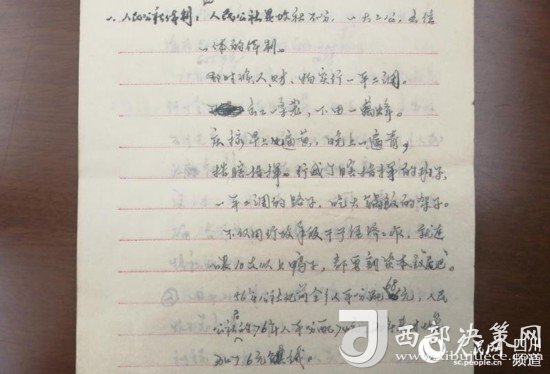 這本工作筆記內(nèi)頁紙上的字跡娟秀工整,細(xì)密地記錄著對人民公社的一些看法:“人民公社是政社不分、一大二公、五位一體的體制;出工一條龍,收工一窩蜂;不僅用行政手段干預(yù)經(jīng)濟工作,就連喂10只以上的鴨子都要割‘尾巴’……”。
