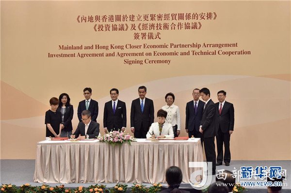 2017年6月28日在香港特區(qū)政府總部拍攝的《內(nèi)地與香港關于建立更緊密經(jīng)貿(mào)關系的安排》(CEPA)下的《投資協(xié)議》和《經(jīng)濟技術合作協(xié)議》簽約儀式現(xiàn)場。 新華社發(fā)(王璽攝)