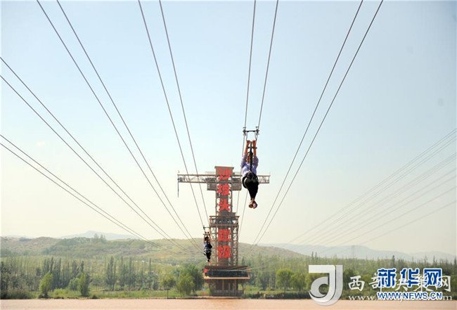 8月22日,游客在中衛(wèi)市沙坡頭旅游景區(qū)體驗溜索。沙坡頭旅游景區(qū)因地制宜發(fā)展沙漠旅游,旺季日接待游客量達兩萬人次。新華社記者任鵬飛攝