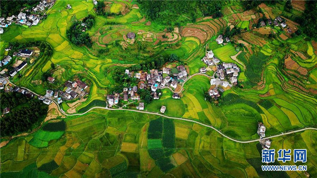 廣西隆林各族自治縣克長(zhǎng)鄉(xiāng)田園景色(9月1日無(wú)人機(jī)拍攝)。