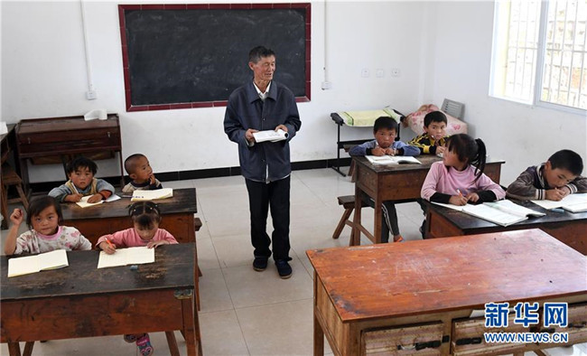 9月5日,云南省祿勸彝族苗族自治縣撒營盤鎮(zhèn)三蒙村阿依羊小學(xué)教師王正祥在給學(xué)生們上課。阿依羊小學(xué)位于海拔2600米的山間,交通不便,全校只有8名學(xué)生。而今年56歲的王正祥既是學(xué)校唯一的老師,也在生活上給了孩子們無微不至的關(guān)心。1980年,王正祥開始從教,在大山深處一干就是38年。他說:“村里就我一個(gè)老師,只要有一個(gè)學(xué)生,我都要教下去,不讓孩子輟學(xué)。希望他們像小鷹一樣飛出大山,能有更光明的未來。”新華社記者 藺以光 攝