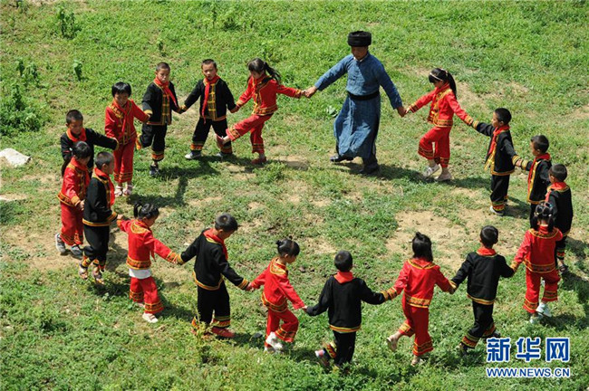 9月5日,貴州畢節(jié)市黔西縣花溪彝族苗族鄉(xiāng)豐坪小學(xué)教師楊朝俊和學(xué)生一起跳民族舞蹈。時(shí)至今日,楊朝俊在當(dāng)?shù)亟虝延?4個(gè)年頭,曾孤身一人守著豐坪小學(xué)兩個(gè)年級的30余名學(xué)生,照顧他們的學(xué)習(xí)和生活。楊朝俊默默堅(jiān)守的事跡,吸引了一名支教老師前來“搭班”。今年新學(xué)期開學(xué)時(shí),當(dāng)?shù)亟逃块T又選派了一名年輕的特崗教師來到學(xué)校,分擔(dān)教學(xué)工作。新華社發(fā)(楊文斌攝)