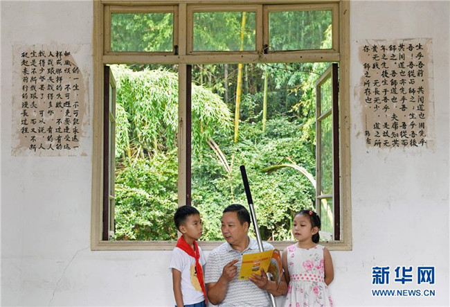在江西南昌灣里區(qū)立新村立新學(xué)校,鄉(xiāng)村教師高自仁在課間休息時(shí)給學(xué)生講解科學(xué)知識(9月3日攝)。因患小兒麻痹左腿行動(dòng)不便的高自仁1977年高中畢業(yè)后回到老家,在位于梅嶺大山深處的山村里做一名教師。41年來,高自仁拄著拐杖跋涉在崎嶇山路,堅(jiān)守在三尺講臺,培養(yǎng)了一批又一批學(xué)生,幫助他們走出大山。新華社記者 萬象 攝
