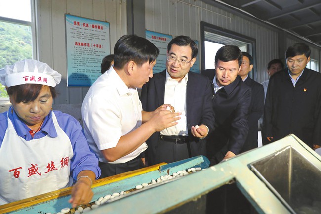 鎮(zhèn)安縣是深度貧困縣,自然條件差,貧困人口多,脫貧難度大。胡和平首先來到永樂街道辦事處中合村永田農(nóng)業(yè)發(fā)展公司,實地調(diào)研食用菌產(chǎn)供銷一體化脫貧項目,詳細(xì)了解產(chǎn)品生產(chǎn)工藝和銷售情況,鼓勵企業(yè)擴(kuò)大生產(chǎn)規(guī)模,提升品牌價值,做大海外市場,在提高效益的同時增強(qiáng)帶動群眾增收能力。在百盛繅絲廠,胡和平聽取公司生產(chǎn)經(jīng)營和脫貧幫扶情況介紹,了解選繭、煮繭、繅絲、復(fù)整等生產(chǎn)流程,并與前來出售蠶繭的農(nóng)民張秀成交談。當(dāng)聽說張秀成今年養(yǎng)繭收入6000多元,胡和平十分高興。他希望企業(yè)依托商洛青山綠水,發(fā)展綠色產(chǎn)業(yè),延長產(chǎn)業(yè)鏈條,帶動更多群眾擺脫貧困。