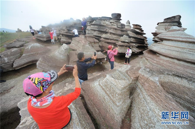 9月16日,游客在貴州省松桃苗族自治縣盤石鎮(zhèn)紅石林景區(qū)游覽。